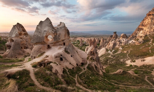 After breakfast at hotel transfer to Ataturk Apt for early morning flight to Kayseri (TK2010 IST/ASR domestic flight). Upon arrival meet with assistant and drive to Cappadocia. Arrival visit to Red Valley which is one of the most beautiful trekking valleys in Cappadocia. Explore the famous rock-cut churches and hiking for 5km through the valley. After hiking, resting in Old Cavusin Village where is one of old Greek Villages in Cappadocia. The village is known with its houses and churches of the Christian clergymen. After lunch at local restaurant visit to Kaymakli Underground City, the place early Christians hid from persecutors. Finally visit to Pigeon Valley. Transfer to the hotel and check-in. Dinner and overnight at Hotel / Cappadocia.